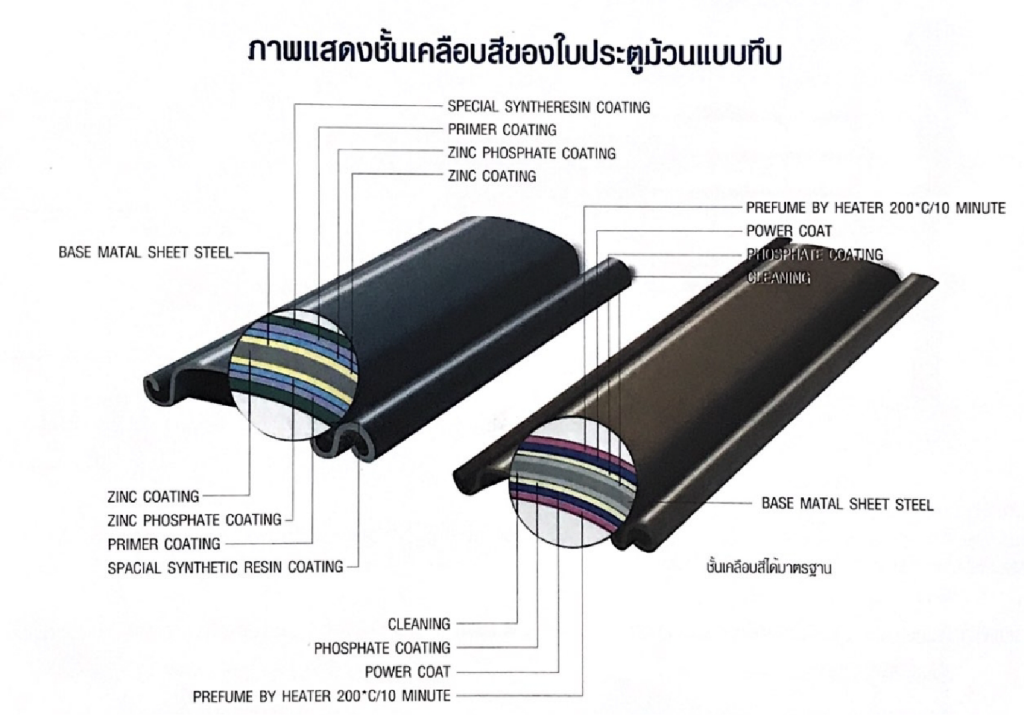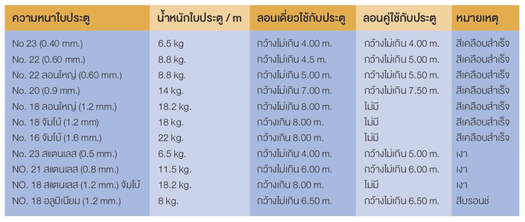 7.50 mm. ความหนาของใบประตูเหล็กเคลือบ หนา 0.40 mm, 0.60 mm. 0.9 mm. ระบบ